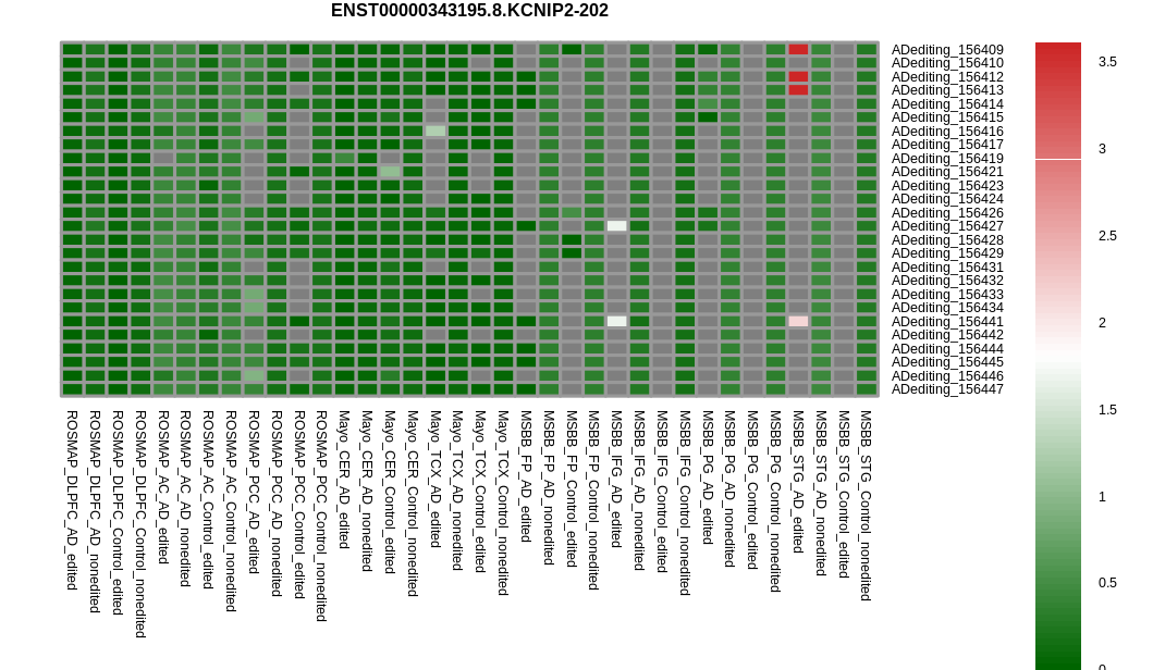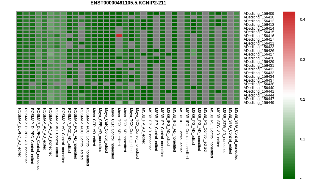 Distribution of the averaged gene expression in AD and control with or without RNA A-to-I editing event.* The grey color means N/A. |